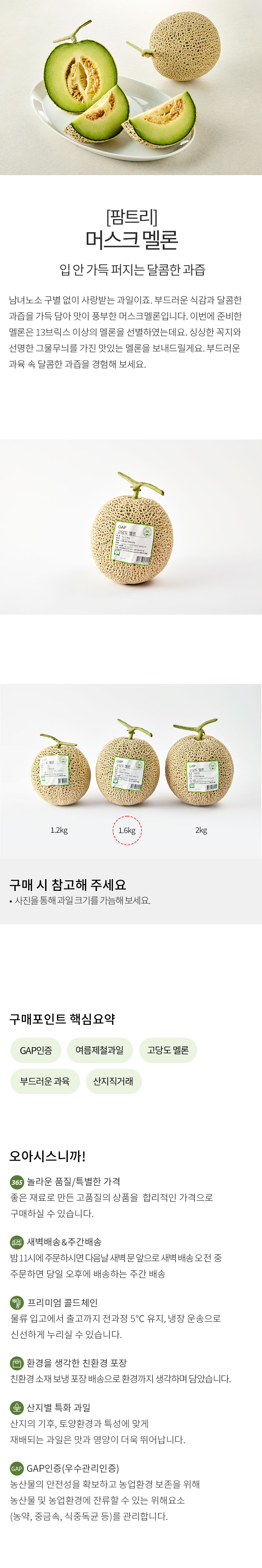 머스크멜론(1.6kg) 수량빼기 수량추가 8,900 원 총 수량 1 개 8,900 원 구매옵션 닫기 찜하기 추가 찜하기 삭제 구매후기 338 상품상세 정기구독 장바구니 정기구독 장바구니 구매하기 정기배송 장바구니