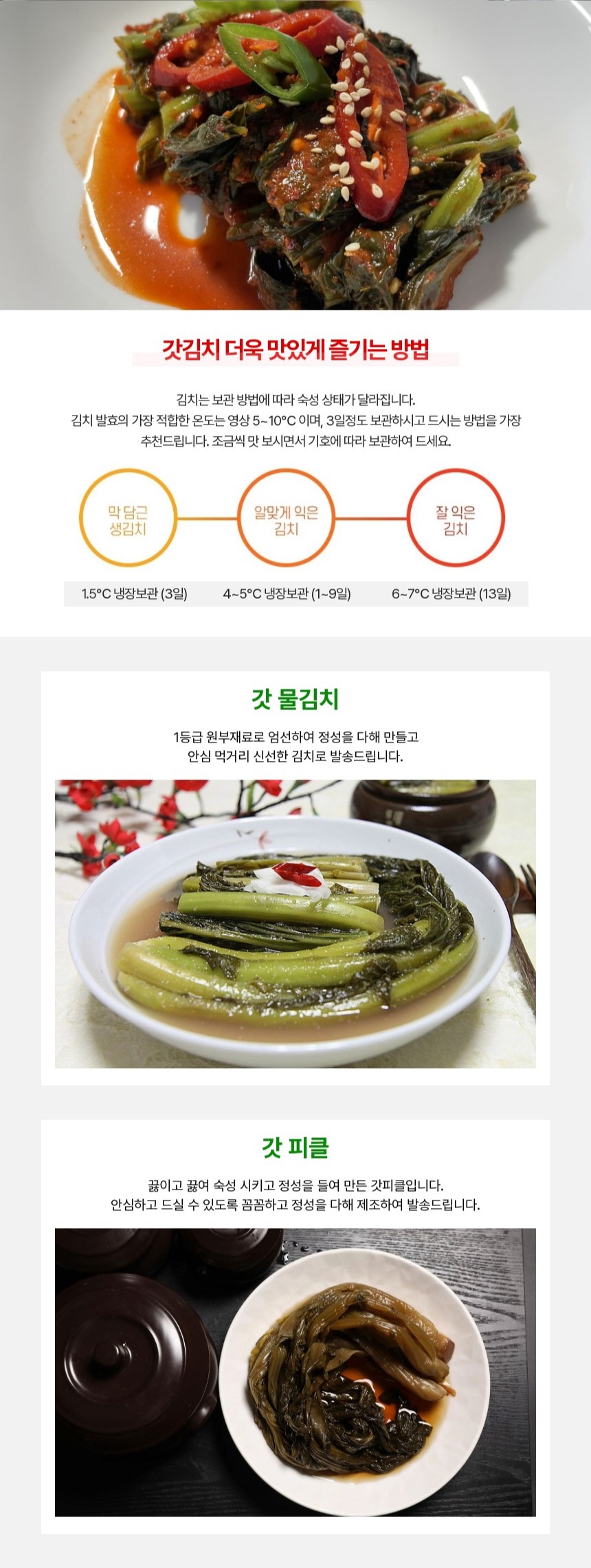 - 절임갓 70% [갓95%(국내산), 식염 5%(국내산)] 고춧가루 8% (국내산), 찹쌀풀 6%(국내산), 생강 2%, 건고추 2%, 마늘 2%, 멸치젓 3%, 새우젓 2%, 설탕 2%, 배 3% (국내산)