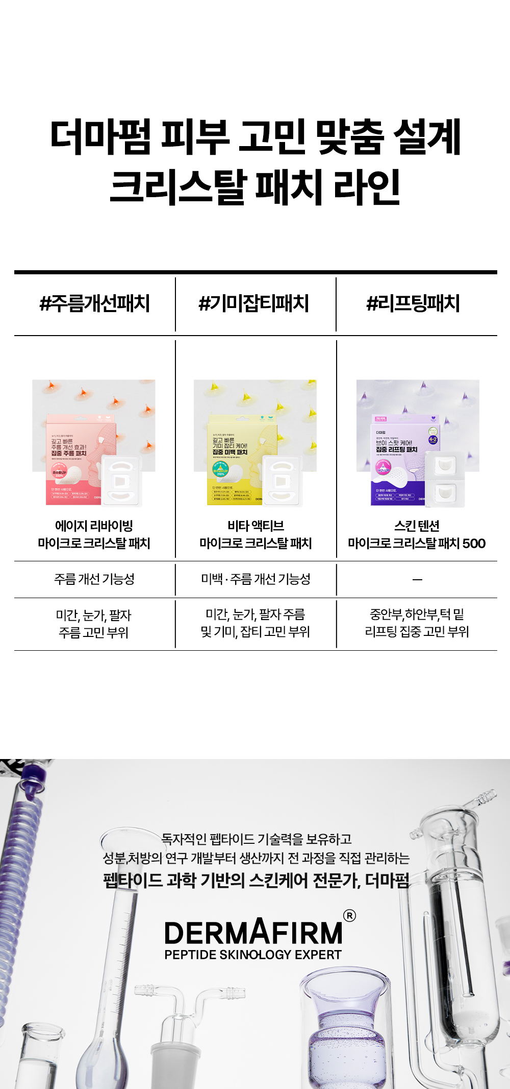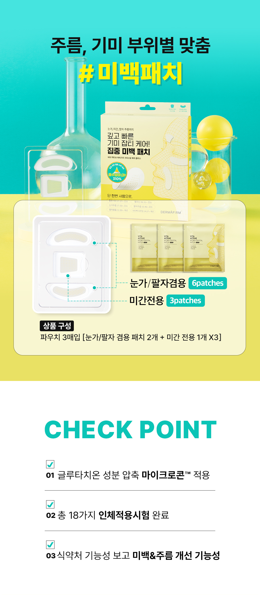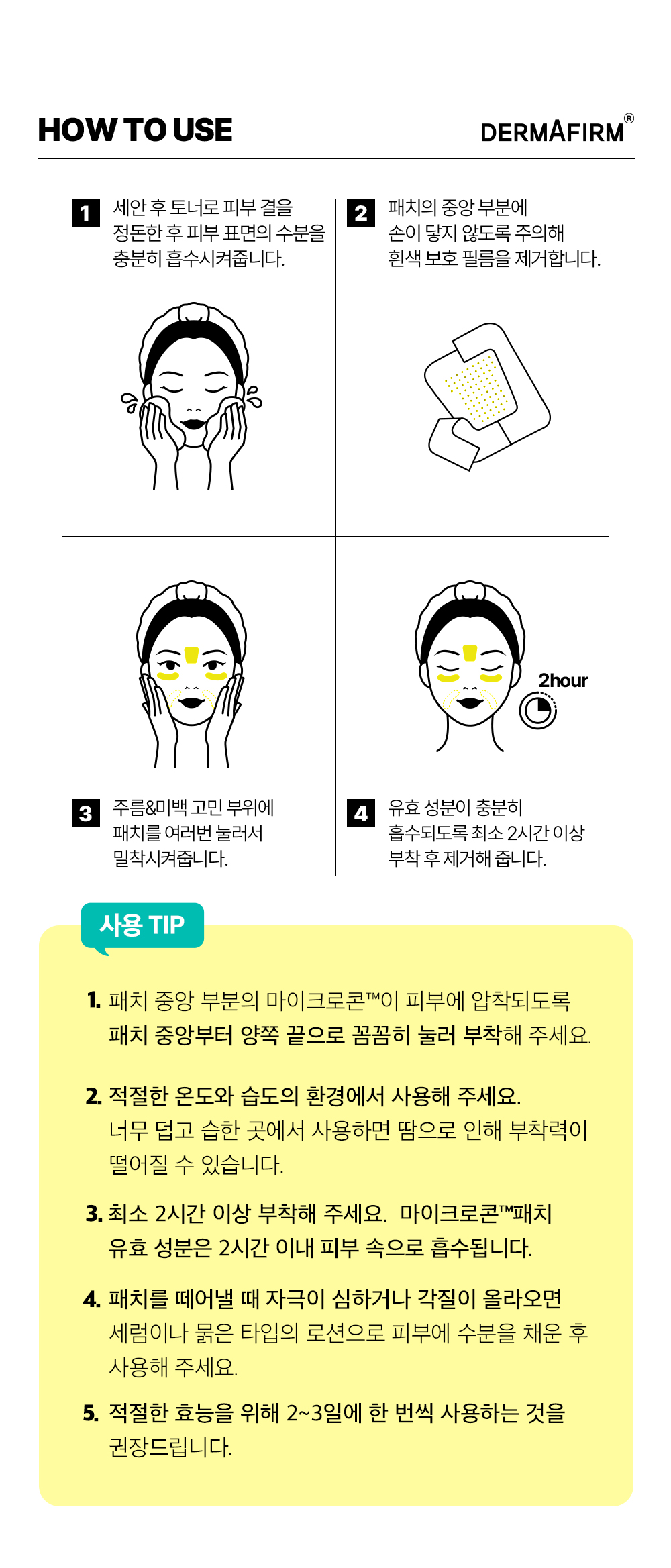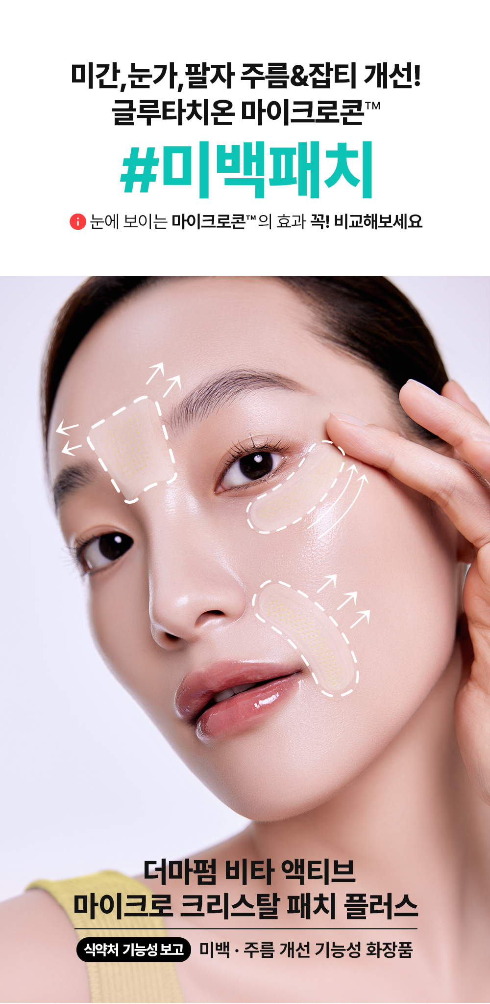피부에 직접 유효 성분을 전달하는 더마펌 비타액티브 마이크로 크리스탈 패치로, 칙칙하고 힘없는 피부에 생기를 불어넣으세요. 바르기만 해서는 흡수되기 어려운 비타민 성분을 마이크로 크리스탈 형태로 만들어 피부 속까지 효과적으로 전달합니다. 수많은 유효 성분을 미세한 크리스탈 형태로 굳혀 만든 마이크로 패치가 피부에 부착되는 순간 녹아들면서, 눈가, 팔자, 미간 등 고민되는 부위에 비타민 C 유도체와 히알루론산을 집중적으로 공급합니다. 꾸준히 사용하면 피부 탄력 개선과 함께 맑고 생기 있는 피부로 가꿀 수 있습니다.