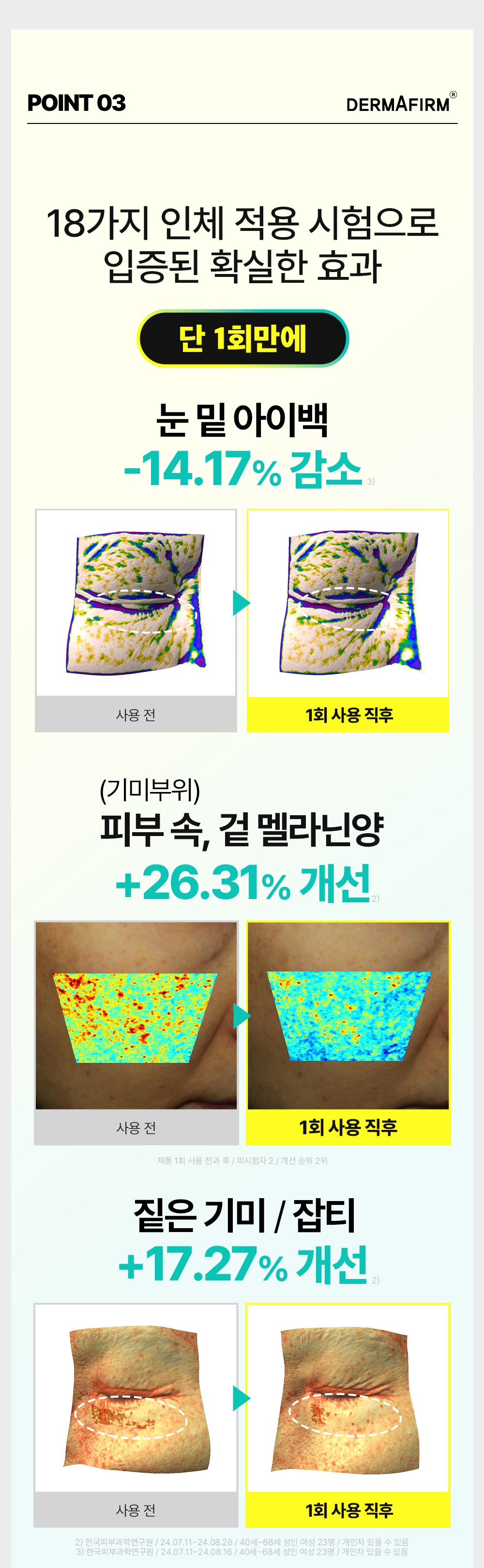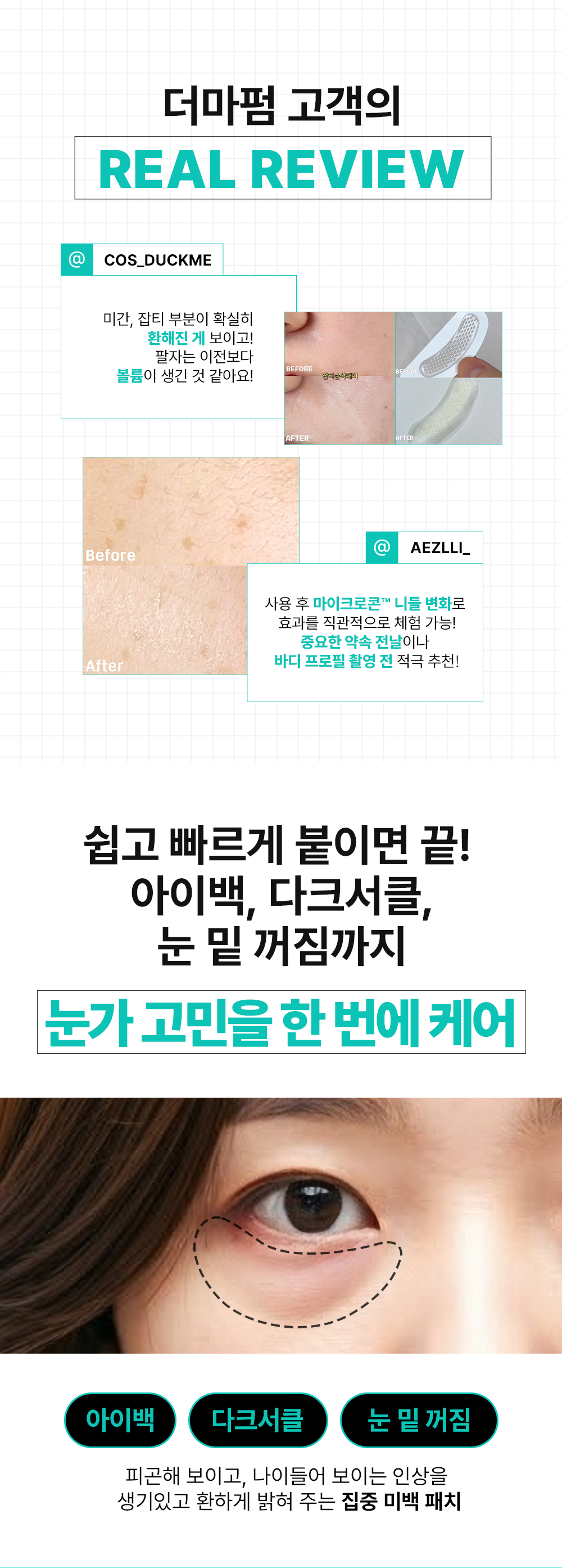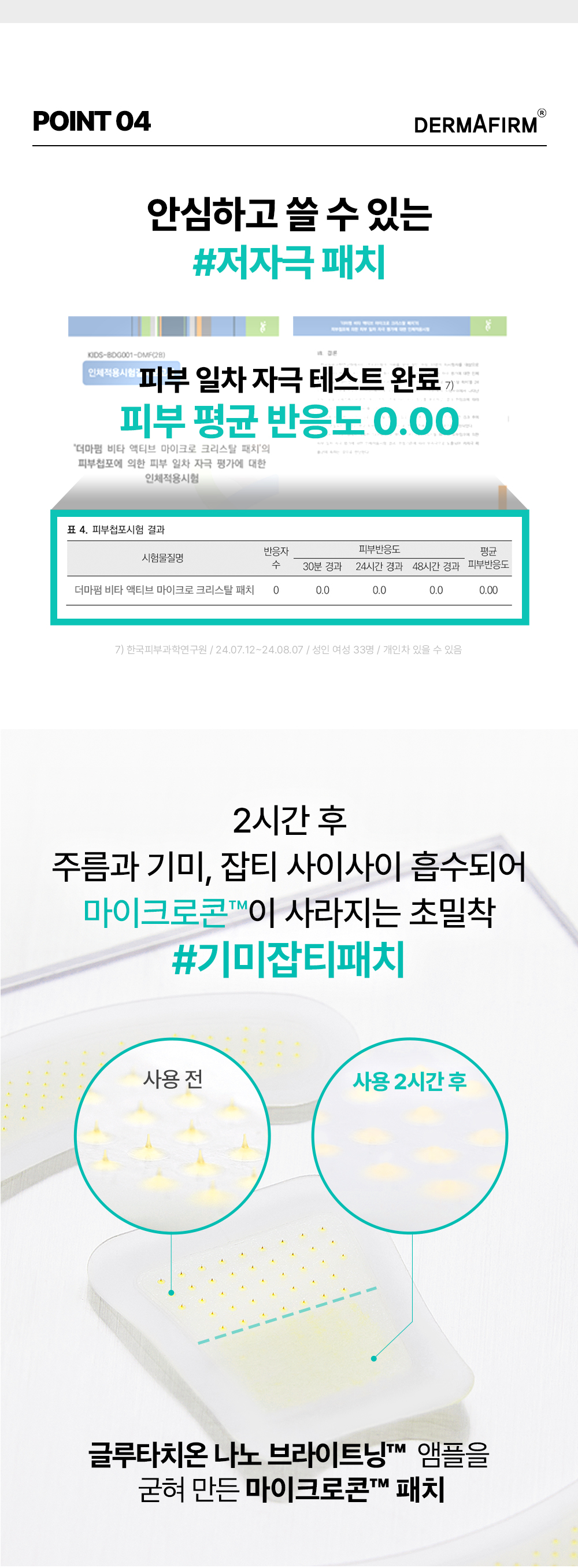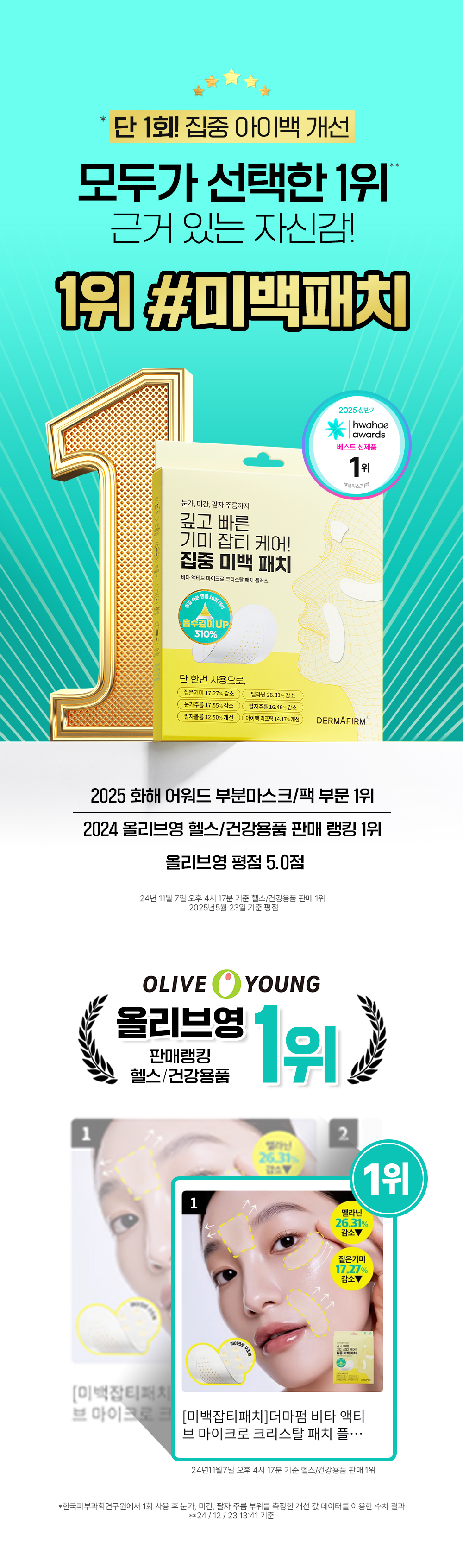 피부에 직접 유효 성분을 전달하는 더마펌 비타액티브 마이크로 크리스탈 패치로, 칙칙하고 힘없는 피부에 생기를 불어넣으세요. 바르기만 해서는 흡수되기 어려운 비타민 성분을 마이크로 크리스탈 형태로 만들어 피부 속까지 효과적으로 전달합니다. 수많은 유효 성분을 미세한 크리스탈 형태로 굳혀 만든 마이크로 패치가 피부에 부착되는 순간 녹아들면서, 눈가, 팔자, 미간 등 고민되는 부위에 비타민 C 유도체와 히알루론산을 집중적으로 공급합니다. 꾸준히 사용하면 피부 탄력 개선과 함께 맑고 생기 있는 피부로 가꿀 수 있습니다.