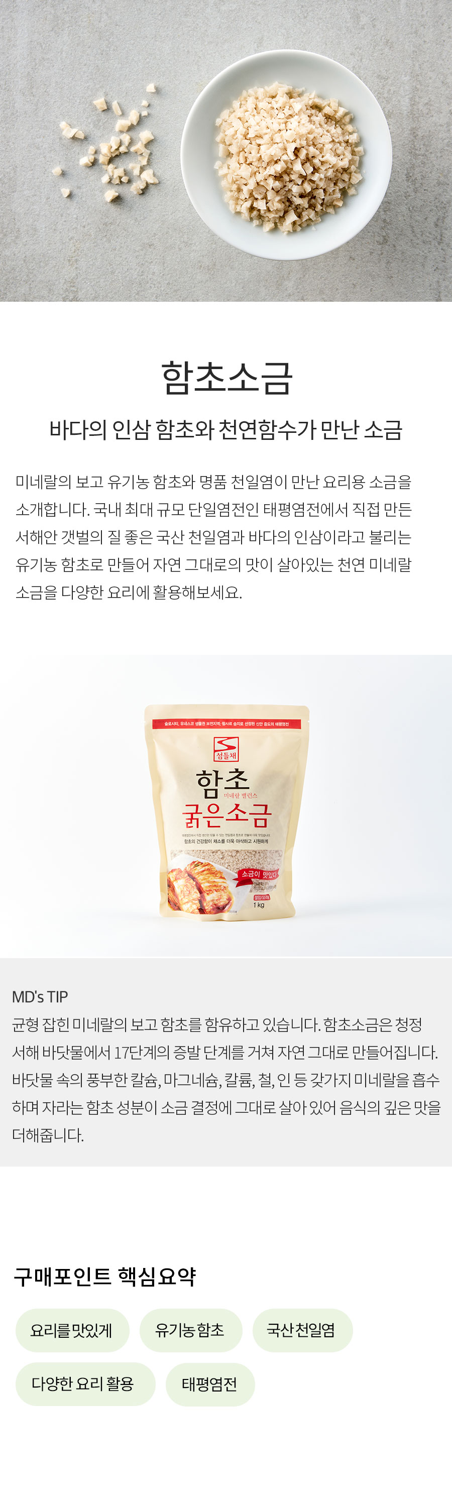 함초 자연 굵은 소금 (1kg) 수량빼기 수량추가 10,400 원 8개 남음 총 수량 1 개 10,400 원 구매옵션 닫기 찜하기 추가 찜하기 삭제 구매후기 509 상품상세 정기구독 장바구니 정기구독 장바구니 구매하기 정기배송 장바구니