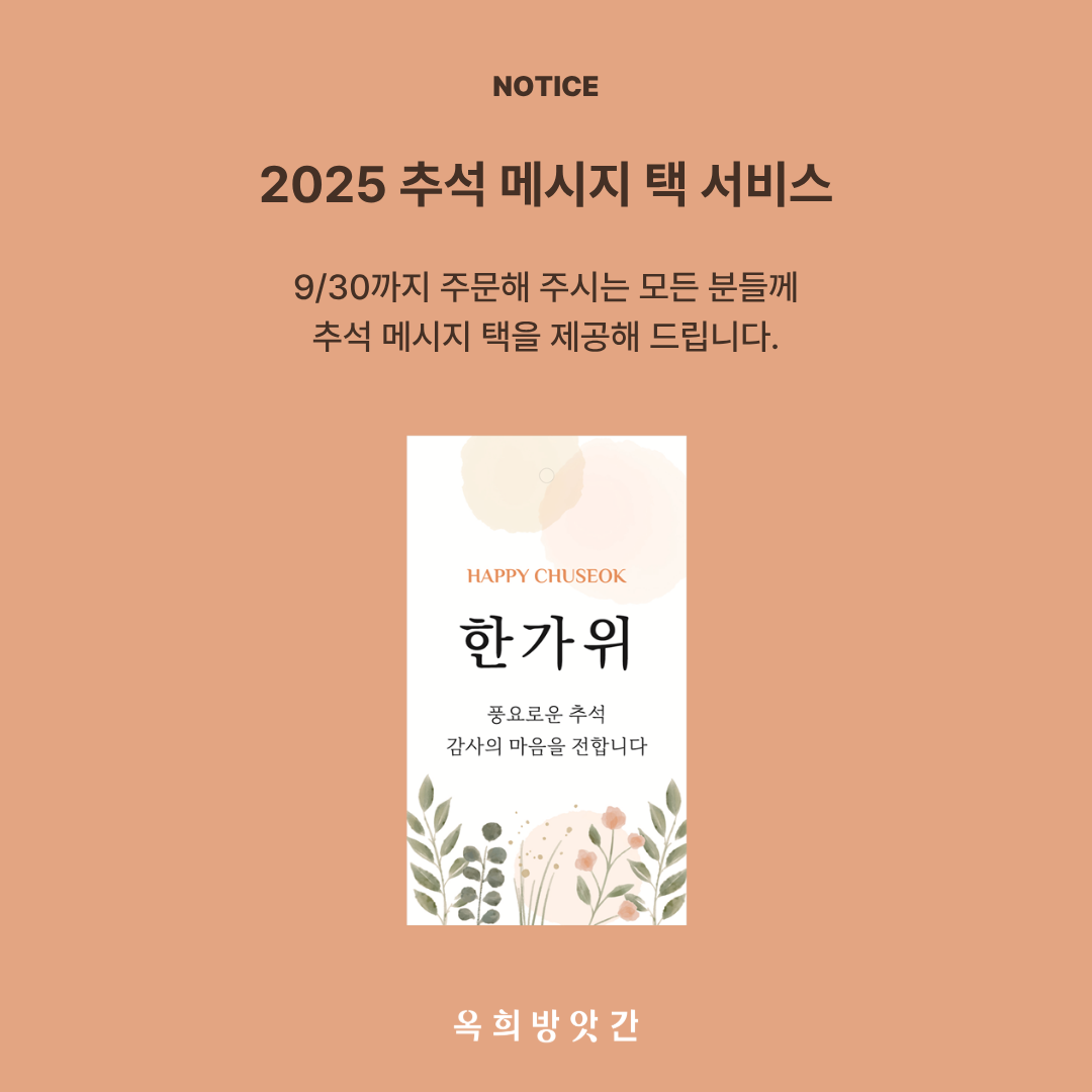 * 결혼/승진/돌잔치 답례품 또는 단체 주문 건은 성함, 회사 로고 등 원하는 메시지와 함께 메시지 택 제작이 가능합니다. 옥희방앗간(0507-1302-9246)으로 문의해 주세요.