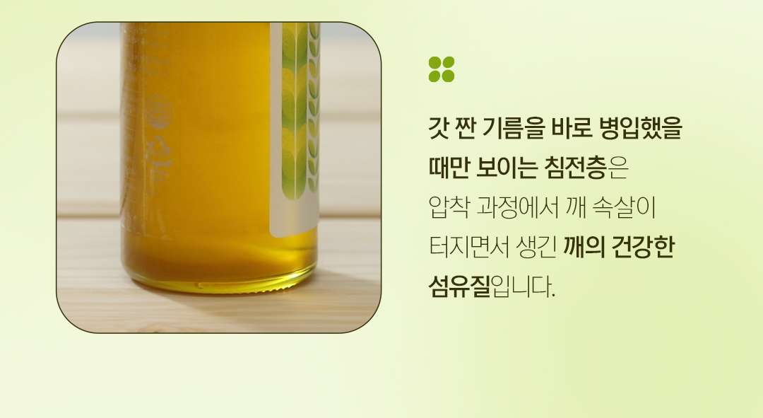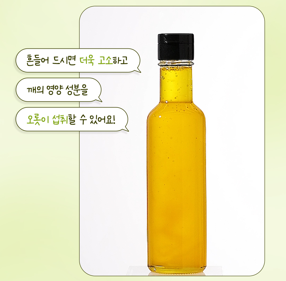 - 직사광선을 피해 서늘한 곳에 보관하십시오. 내용물 중에 침전이 있을 수 있으나 이는 종자 고유의 성분입니다. 동절기나 냉장보관 시 응고, 동결되는 경우가 있으나 품질에는 이상이 없으며, 흔들어서 사용하시면 고유의 맛과 향이 유지됩니다.