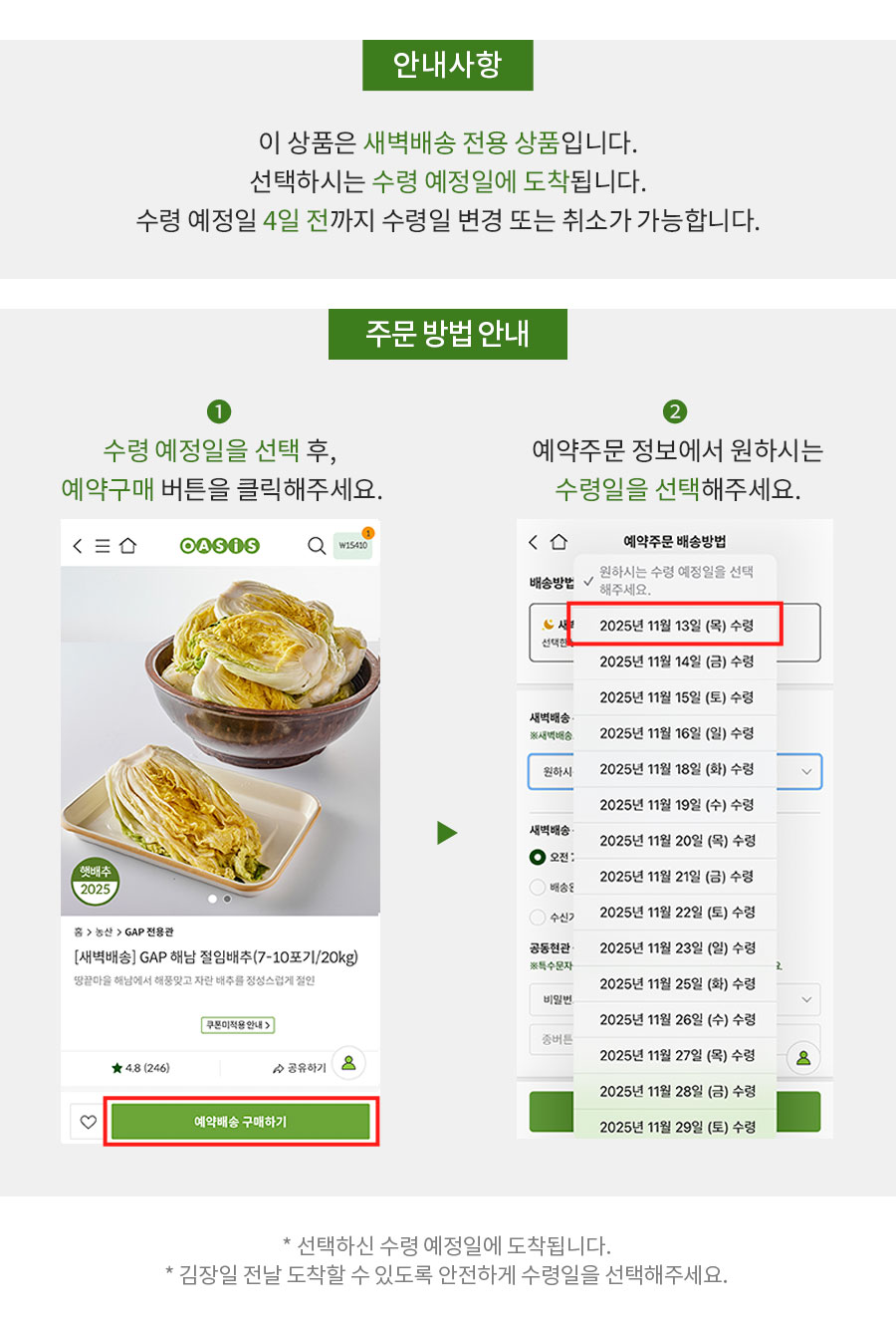 아래와 같이 지정된 새벽배송일에 받으실 수 있습니다.
