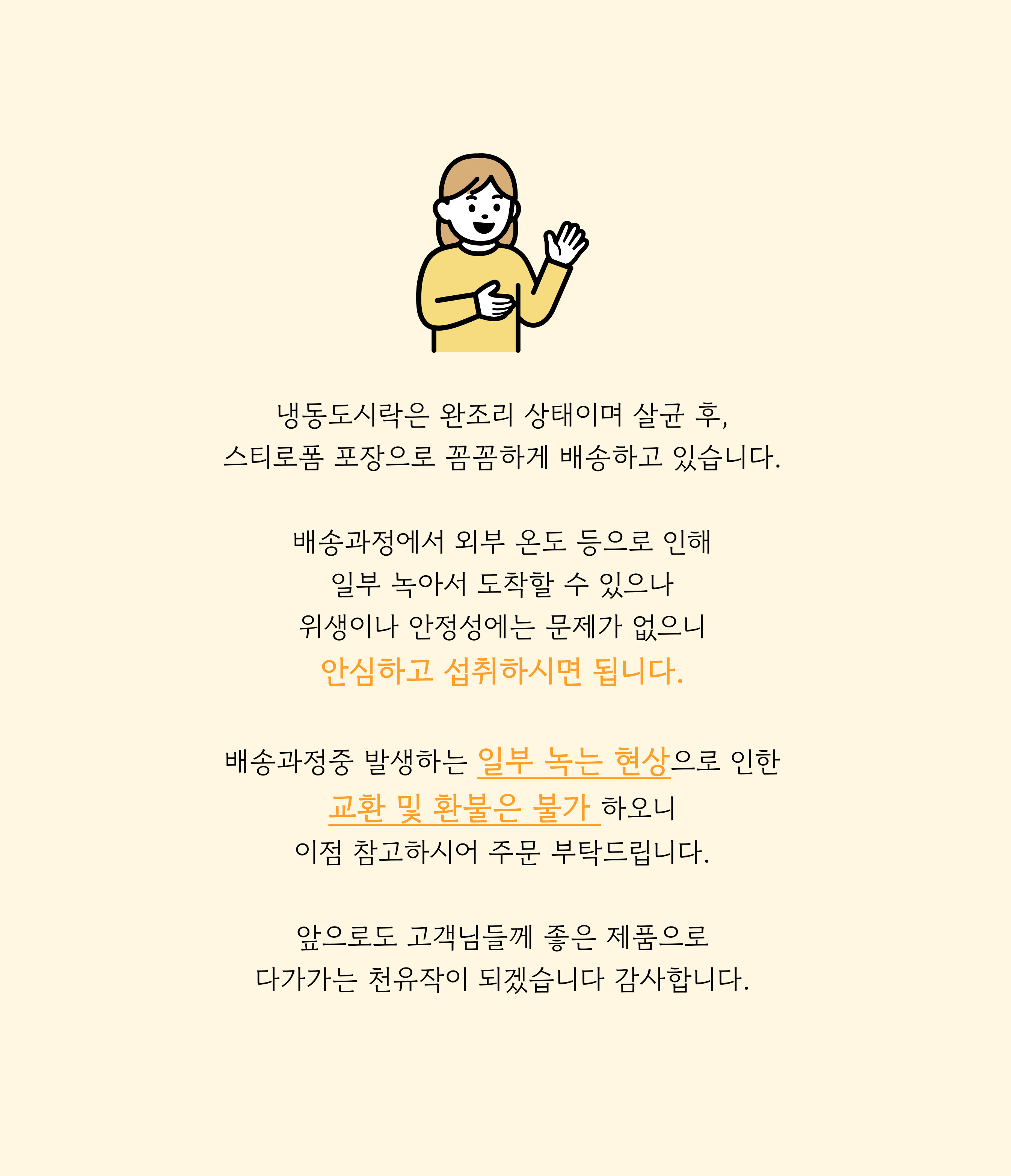 꼭 끓는 물이나 전자레인지를 이용하여 조리하여 섭취하시고, 해동 후 재냉동하지 마십시오
